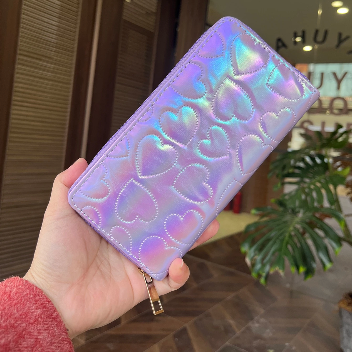 Monedero grande de corazones tornasol morado